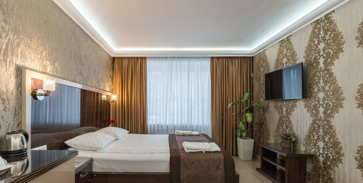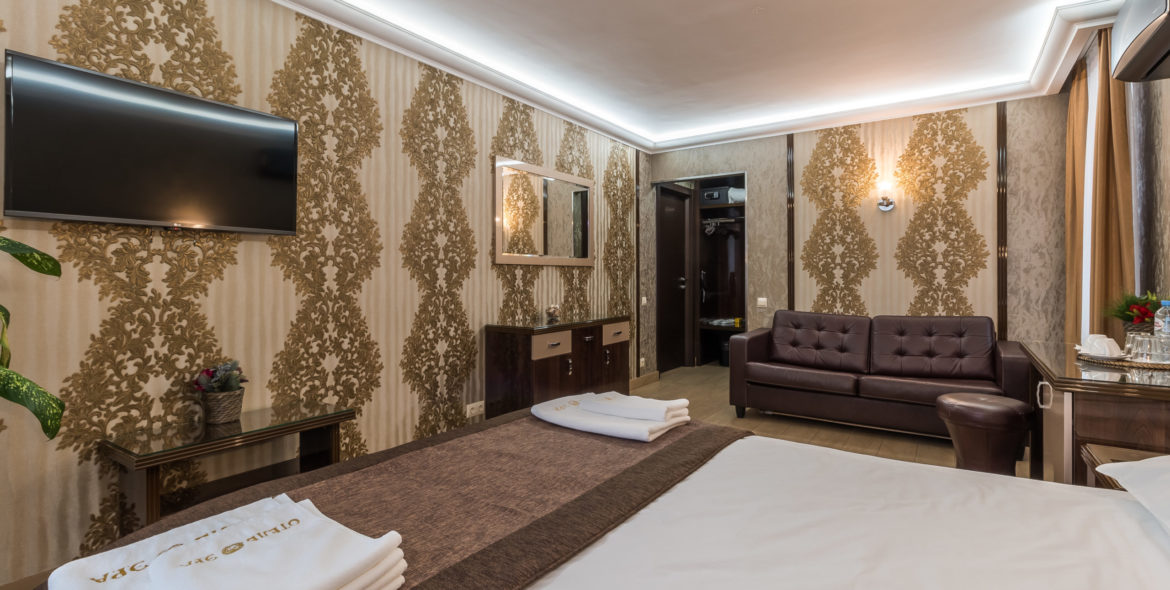 В номере: двуспальная кровать, двуспальный кожаный диван, холодильник, сейф, ТВ, кондиционер, чайник.