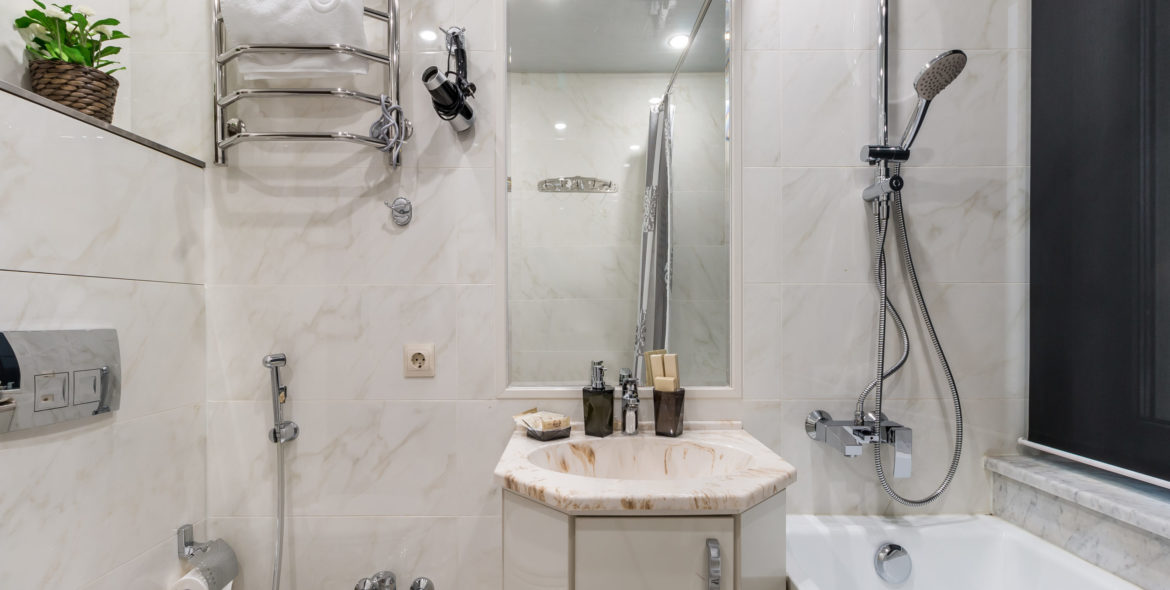Мраморная ванная комната со всеми необходимыми принадлежностями.